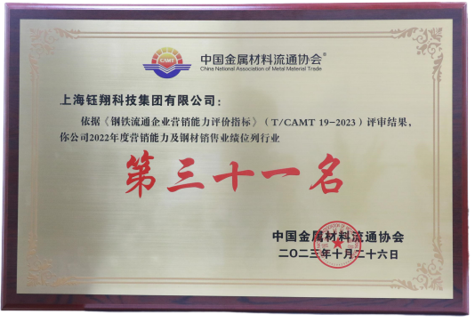 中國金屬材料流通協(xié)會 2022年度營銷能力及鋼鐵銷售業(yè)績位列行業(yè)第三十一名