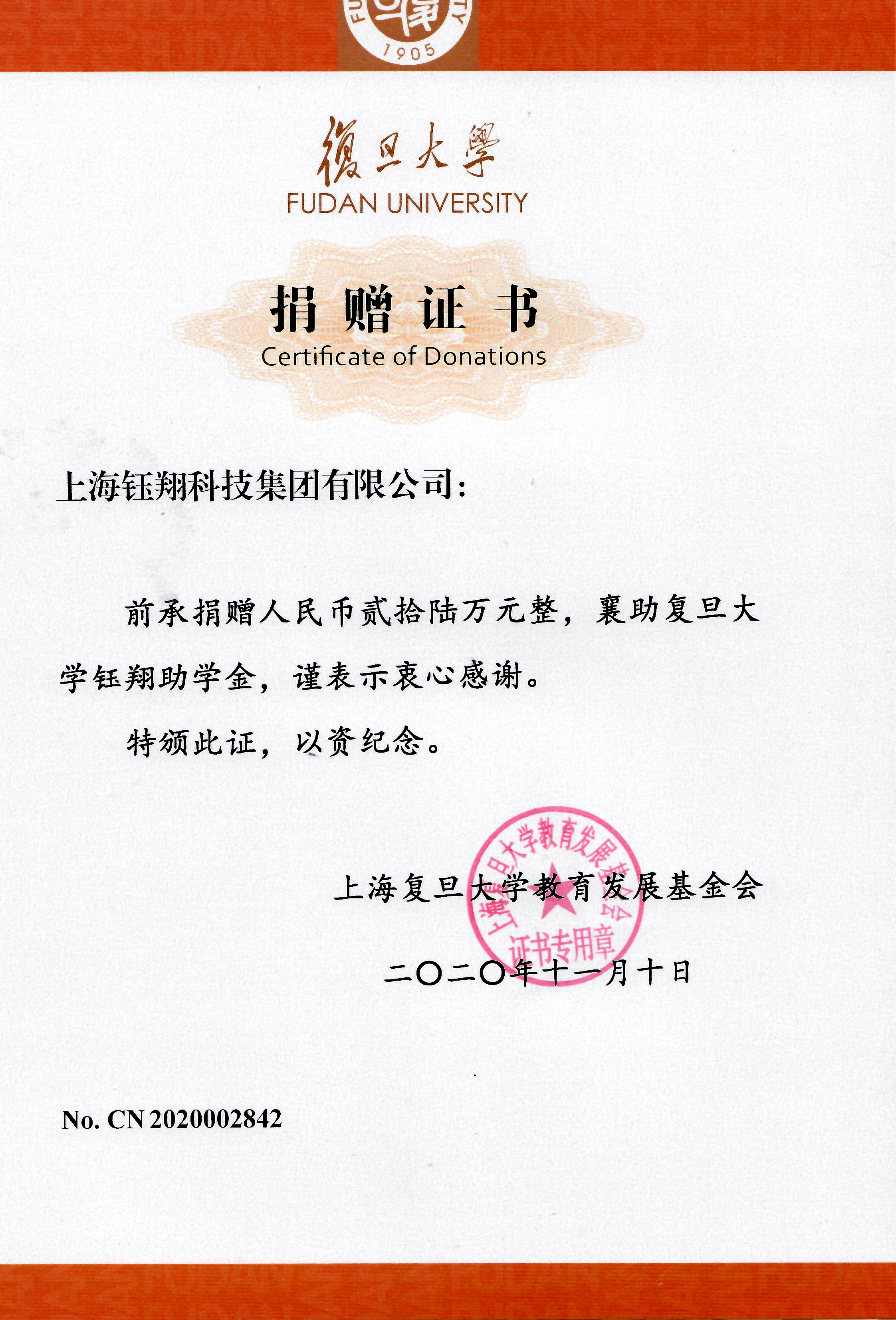 上海復(fù)旦大學(xué)教育發(fā)展基金會(huì)26萬(wàn)元捐贈(zèng)證書(shū)