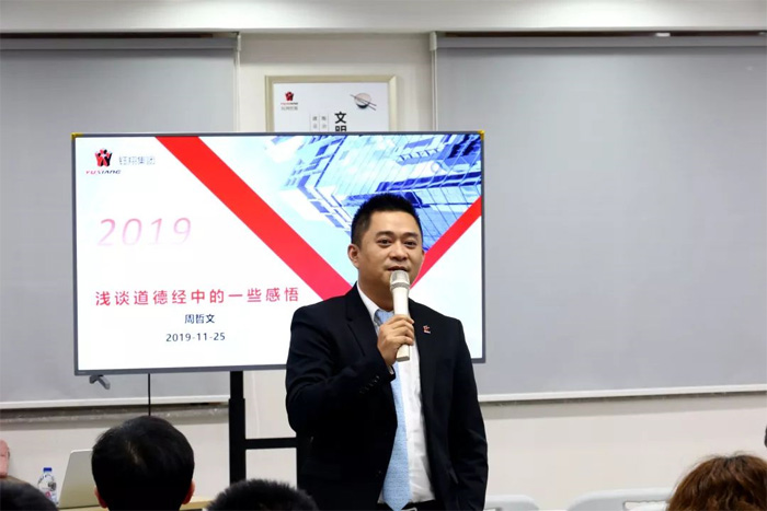 久源經(jīng)貿(mào)總經(jīng)理周哲文介紹了道德經(jīng)的產(chǎn)生始末和自己在閱讀后的職場感悟。他從學(xué)習(xí)忠、信、仁的思想和管理之術(shù)兩方面解答了學(xué)習(xí)道德經(jīng)的重要意義,并通過介紹職場小故事闡述了道德經(jīng)中關(guān)于職場和管理方面的重要觀點,并要求大家勤奮學(xué)習(xí),用知識指導(dǎo)工作,維護集團核心價值觀。