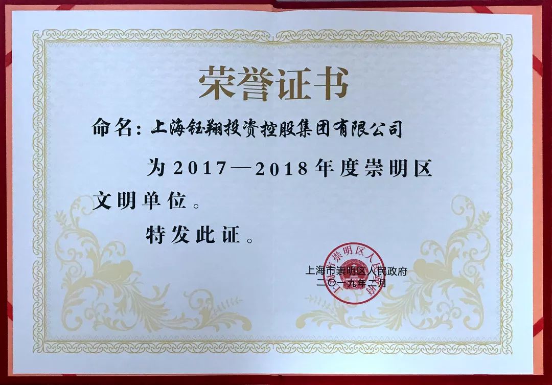 近日,鈺翔控股集團(tuán)再次被評為上海市崇明區(qū)文明單位,截至目前,鈺翔控股集團(tuán)已經(jīng)連續(xù)榮獲第十七屆(2013—2014年度)、第十八屆(2015—2016年度)上海市文明單位榮譽稱號,目前正在積極參評第十九屆(2017—2018年度)上海市文明單位。