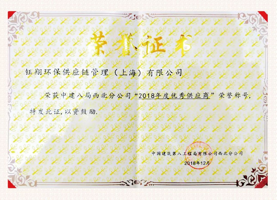 鈺翔環(huán)保供應(yīng)鏈管理(上海)有限公司被中建八局西北分公司評(píng)為2018年度優(yōu)秀供應(yīng)商,這不但是中建八局西北分公司對(duì)鈺翔環(huán)保2018年供應(yīng)鏈管理服務(wù)的肯定,更是對(duì)未來(lái)進(jìn)一步合作的勉勵(lì)。